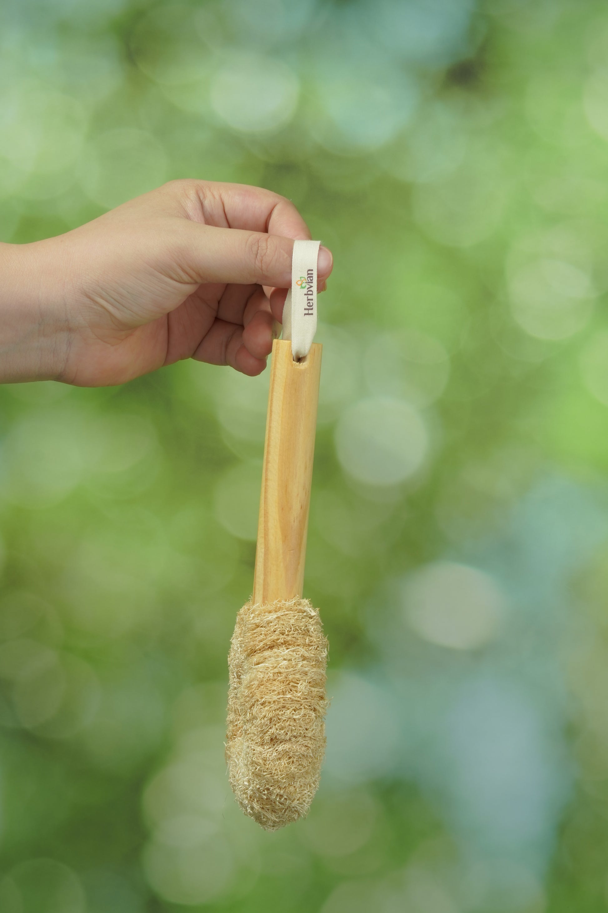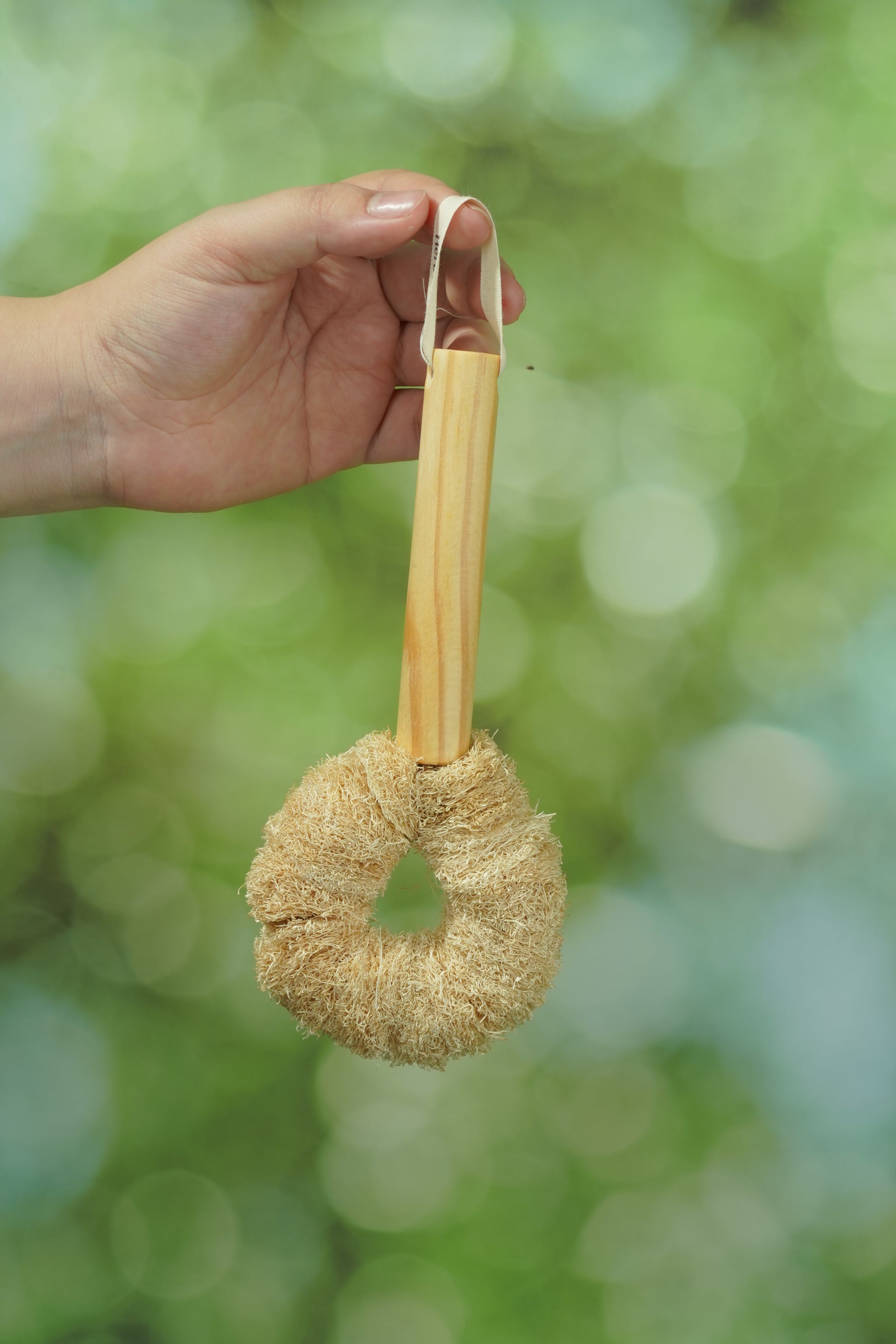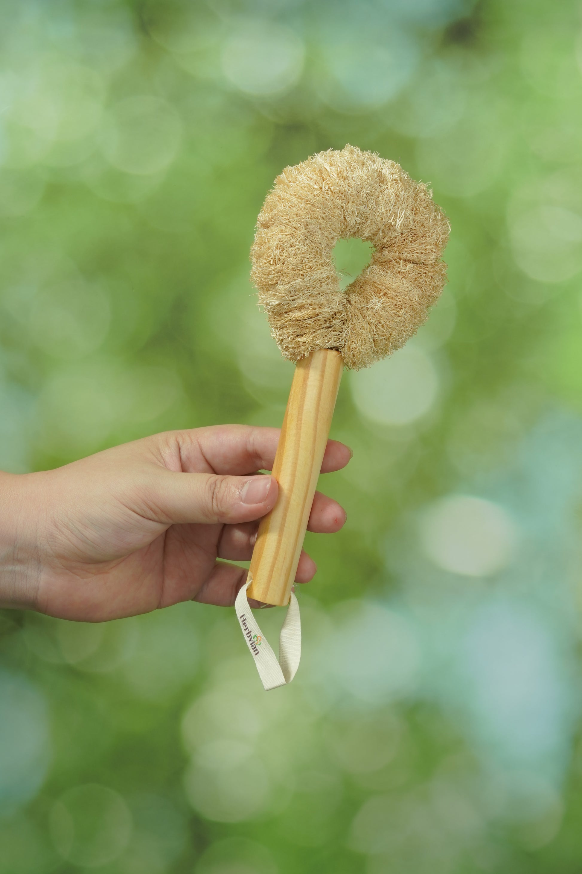 Crafted from natural loofah and a sturdy wooden handle, this donut-shaped scrubber is perfect for deep cleaning pots, pans, and kitchenware.